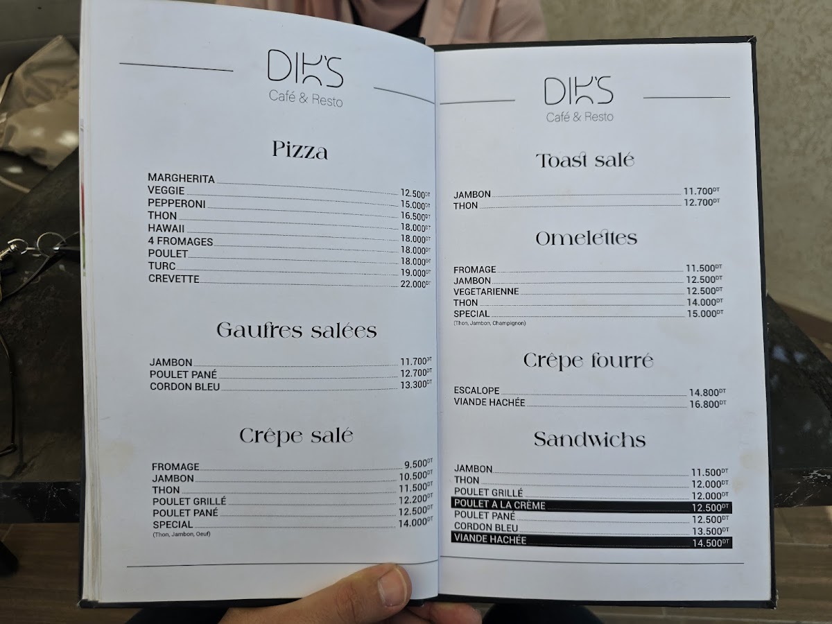 If you’re in the mood for something equally satisfying, explore their Panuzzo / Makloub offerings. The Escalope À La Crème (harissa, mayonnaise, onions, and cream sauce) at TND 18.200 promises to warm your heart with its creamy texture and robust essence. Or, go for the traditional pizzas, where the Pizza Margherita (with fresh mozzarella and basil for just TND 17.600) is a must-try for anyone craving a classic yet flavorful slice. Each pizza comes beautifully crafted, with a perfect balance of flavors that make every bite a treat.